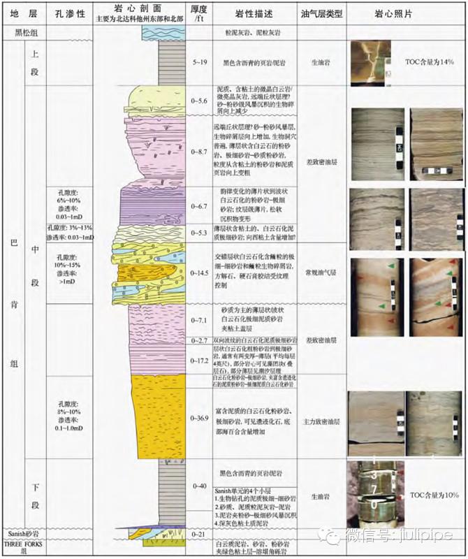 巴肯組上下為頁巖層,富含有機(jī)質(zhì),一直處于生油窗階段,孔隙度在2%~4%,滲透率小于0.1MD,含油飽和度達(dá)70%~80%,而巴肯組的中間是致密層,油氣運(yùn)移聚集在這套地層中。