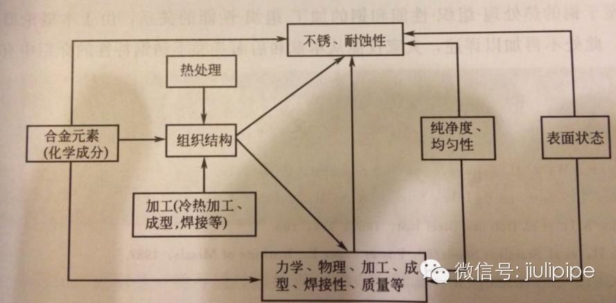 從示意圖中可看出,要研究和了解不銹鋼,實際上既要了解不銹鋼成分-組織-性能的關系,同時還要了解熱處理-組織-性能的關系和加工-組織-性能的關系以及鋼的純凈度、均勻性和表面狀態(tài)等的影響。
