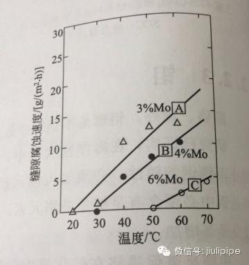 鉬能顯著促進鉻在鈍化膜中的富集,從而增強不銹鋼鈍化膜的穩(wěn)定性,顯著強化鋼中鉻的耐蝕作用,從而大大提高各類不銹鋼的不銹性和耐各種還原性酸介質(zhì)的耐蝕性。圖1在不同濃度H2SO4濃度增高,為獲得同一腐蝕速率的鉬量要增加。為了耐腐蝕,濃度為50%H2SO4比濃度為75%的H2SO4需要更多的鉬,這是因為50%的H2SO4具有更大的腐蝕性。